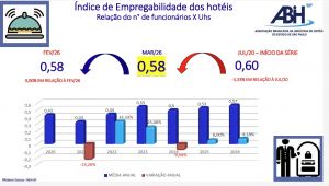 Em comparação com o mesmo período de 2025, somente a TO foi menor em quase 1%. A DM foi superior em 7,67% e o RevPar 6,55%. O RevPar apresentou o segundo maior índice histórico, desde o início da série. A performance dos hotéis de lazer foi satisfatória e os hotéis corporativos retomaram o movimento, como esperado.
